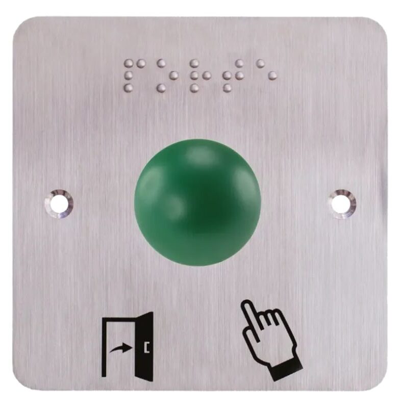 Bouton poussoir impulsionnel SS19 ergonomique, dôme vert, Contact NO+NF, sur plaque acier inox SSP201, 80 x 80 mm, perçage Ø 19 mm, pictogrammes « Porte + doigt » et « PORTE » en braille