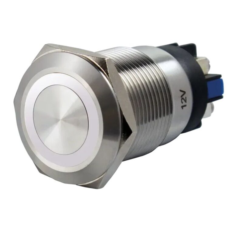 Bouton poussoir SS19, acier inox, Ø 19 mm, halo blanc, 12V AC/DC, Contact NO+NF, raccordement par bornes à vis