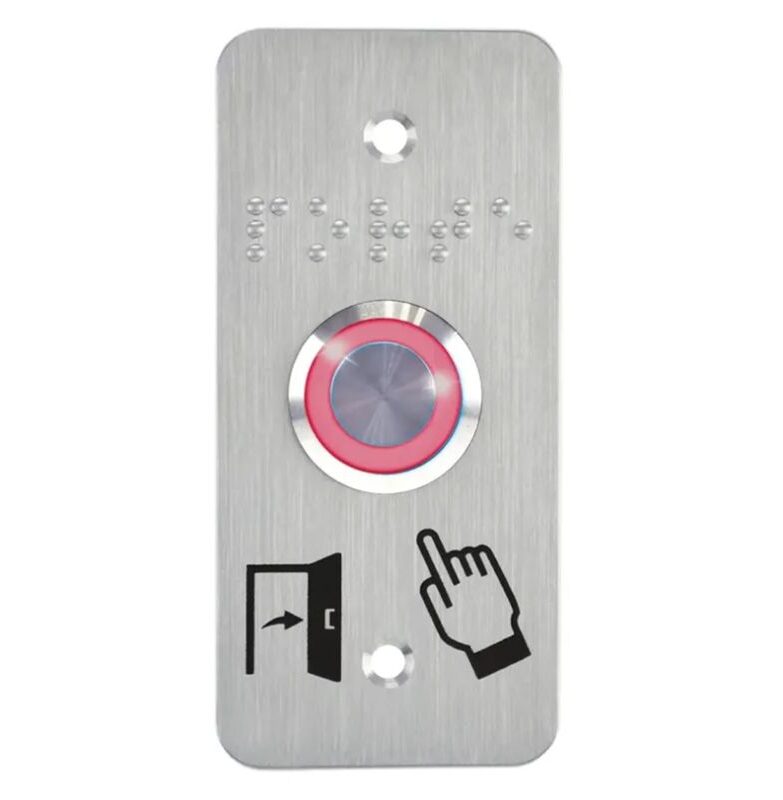 Bouton poussoir SS19, acier inox, Ø 19 mm, halo rouge, 12V AC/DC, Contact NO+NF, raccordement par bornes à vis + Plaque acier inox SSP101, 39,5 x 84,5 mm, perçage Ø 19 mm, pictogrammes « Porte + doigt » et « PORTE » en braille.