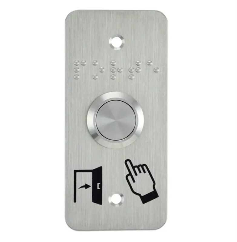 Bouton poussoir SS19, acier inox, Ø 19 mm, Contact NO, raccordement par cosses à souder + Plaque acier inox SSP101, 39,5 x 84,5 mm, perçage Ø 19 mm, pictogrammes « Porte + doigt » et « PORTE » en braille