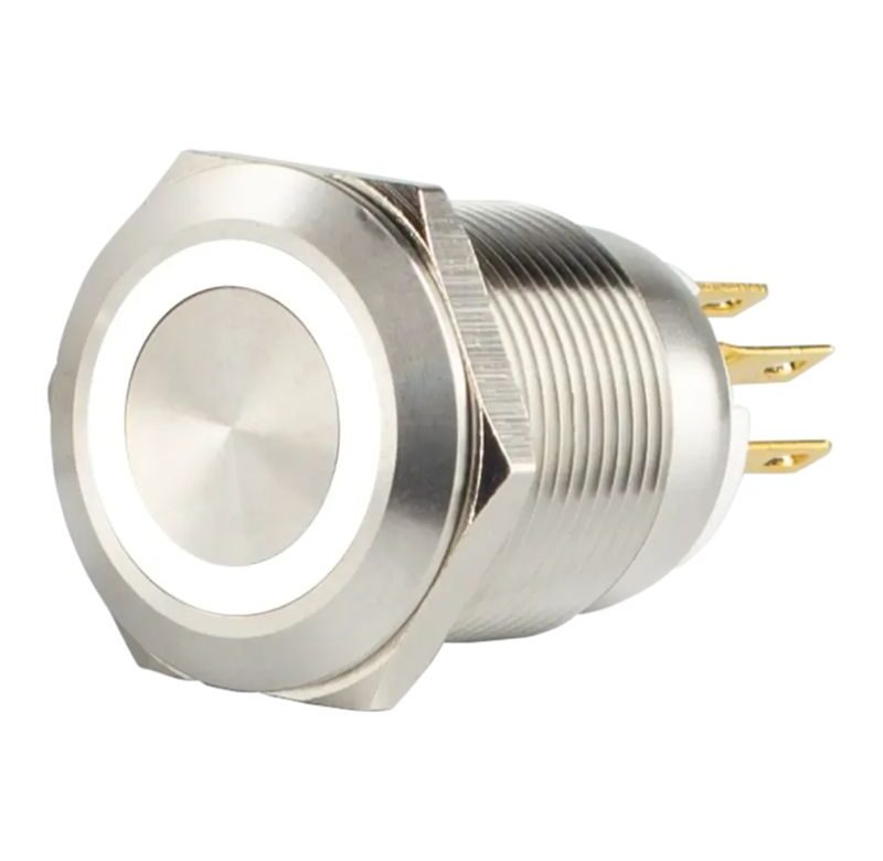 Bouton poussoir SS19, acier inox, Ø 19 mm, halo blanc, 12V AC/DC, Contact NO+NF, raccordement par cosses à souder