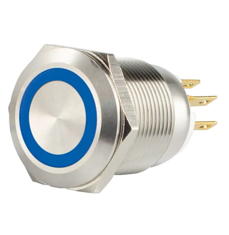 Accueil / Boutique / CONTROLES D'ACCES / ACCES / BOUTONS POUSSOIRS / Bouton poussoir, Ø 19 mm, en acier inoxydable, cosses à souder, halo bleu