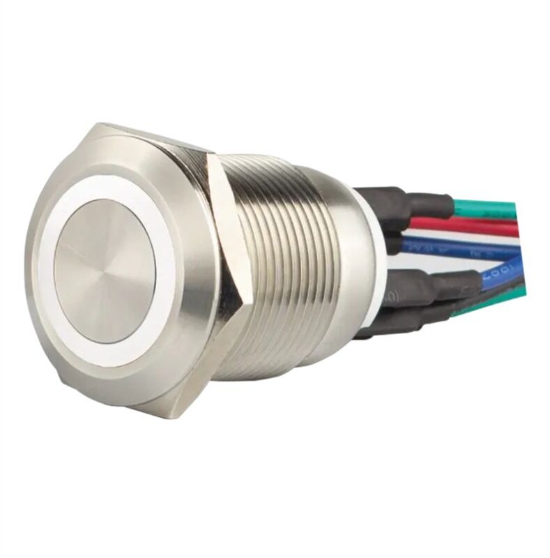 Bouton poussoir SS19, acier inox, Ø 19 mm, halo blanc, 12V AC/DC, Contact NO+NF, raccordement par fils