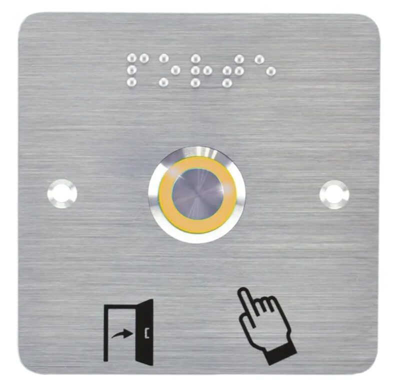 (précablé) + Plaque acier inox SSP201, 80 x 80 mm, perçage Ø 19 mm, pictogrammes « Porte + doigt » et « PORTE » en braille