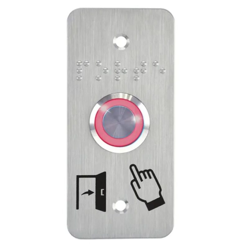 Accueil / Boutique / CONTROLES D'ACCES / ACCES / BOUTONS POUSSOIRS / Bouton poussoir, Ø 19 mm, en acier inoxydable, précâblé, halo rouge, sur plaque étroite
