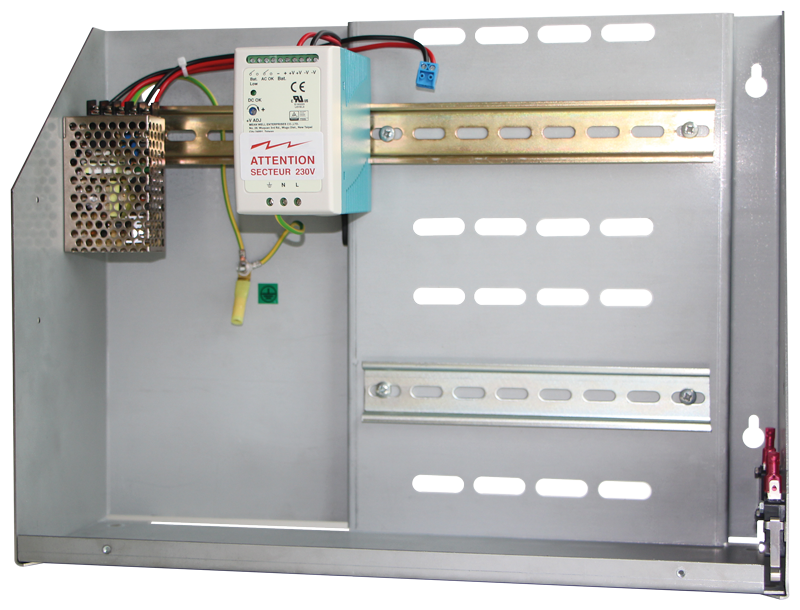Coffret mural et alimentation 12V – emplacements prévus pour mettre une centrale ou un module supplémentaire et batterie d’alimentation (en option)