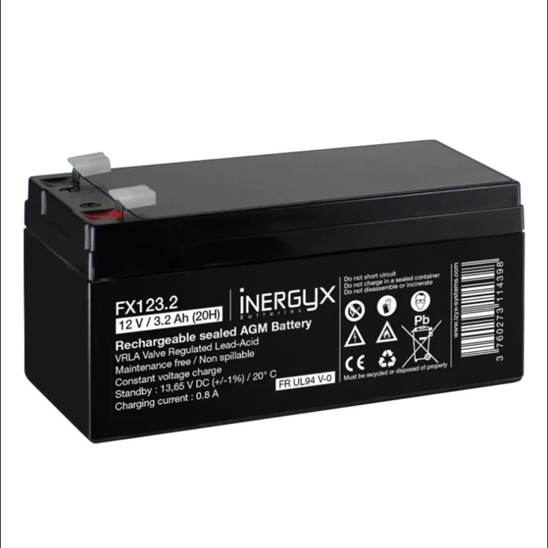 Batterie rechargeable VRLA INERGYX, 12V / 3,2 Ah – Boîtier FR UL94 V-0 – 134 x 67 x 62/67 mm – Bornes FASTON F1 – 4,75 x 0,8 mm