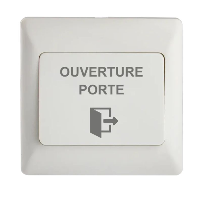 Bouton poussoir ABS, pour pose en encastré, 86 x 86 x 8/14 mm, 1 contact inverseur CO/NO/NF, picto et texte « OUVERTURE PORTE »