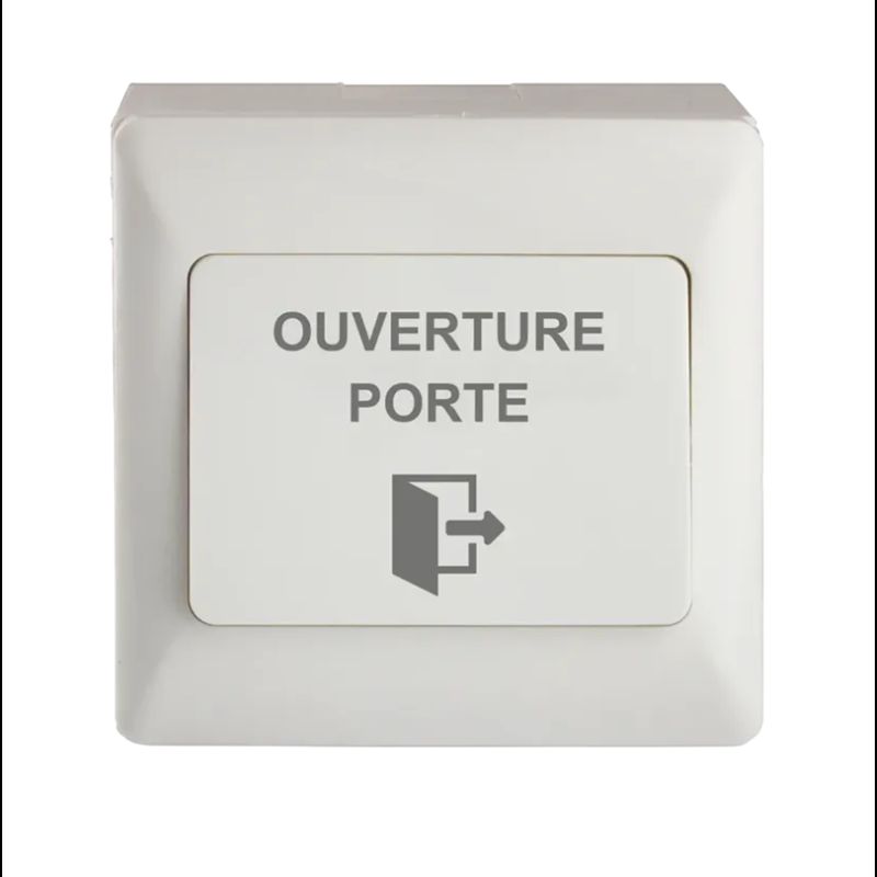 Bouton poussoir ABS, pour pose en applique, 86 x 86 x 38/44 mm, 1 contact inverseur CO/NO/NF, picto et texte « OUVERTURE PORTE »