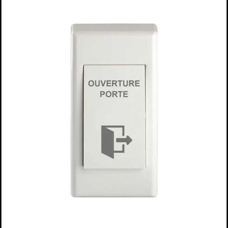 Bouton poussoir ABS étroit, pour pose en applique, 86 x 43 x 22/19mm, 1 contact inverseur CO/NO/NF, picto et texte « OUVERTURE PORTE »