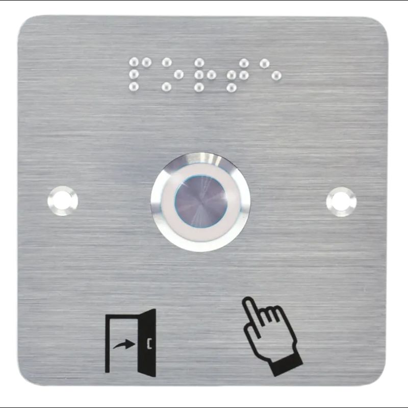 Bouton poussoir SS19, acier inox, Ø 19 mm, halo blanc, 12V AC/DC, Contact NO+NF, raccordement par bornes à vis + Plaque acier inox SSP201, 80 x 80 mm, perçage Ø 19 mm, pictogrammes « Porte + doigt » et « PORTE » en braille