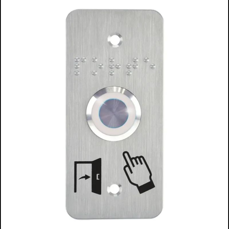 Bouton poussoir SS19, acier inox, Ø 19 mm, halo blanc, 12V AC/DC, Contact NO+NF, raccordement par bornes à vis + Plaque acier inox SSP101, 39,5 x 84,5 mm, perçage Ø 19 mm, pictogrammes « Porte + doigt » et « PORTE » en braille
