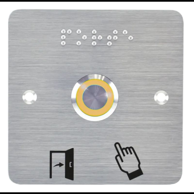 Bouton poussoir SS19, acier inox, Ø 19 mm, halo jaune, 12V AC/DC, Contact NO+NF, raccordement par bornes à vis + Plaque acier inox SSP201, 80 x 80 mm, perçage Ø 19 mm, pictogrammes « Porte + doigt » et « PORTE » en braille