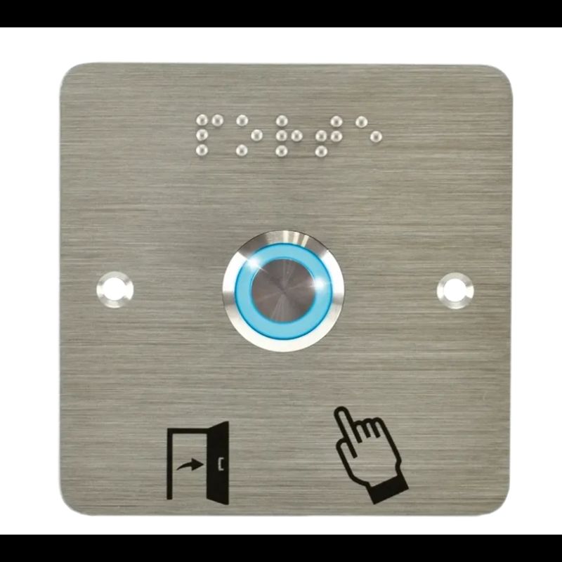(précablé) + Plaque acier inox SSP201, 80 x 80 mm, perçage Ø 19 mm, pictogrammes « Porte + doigt » et « PORTE » en braille