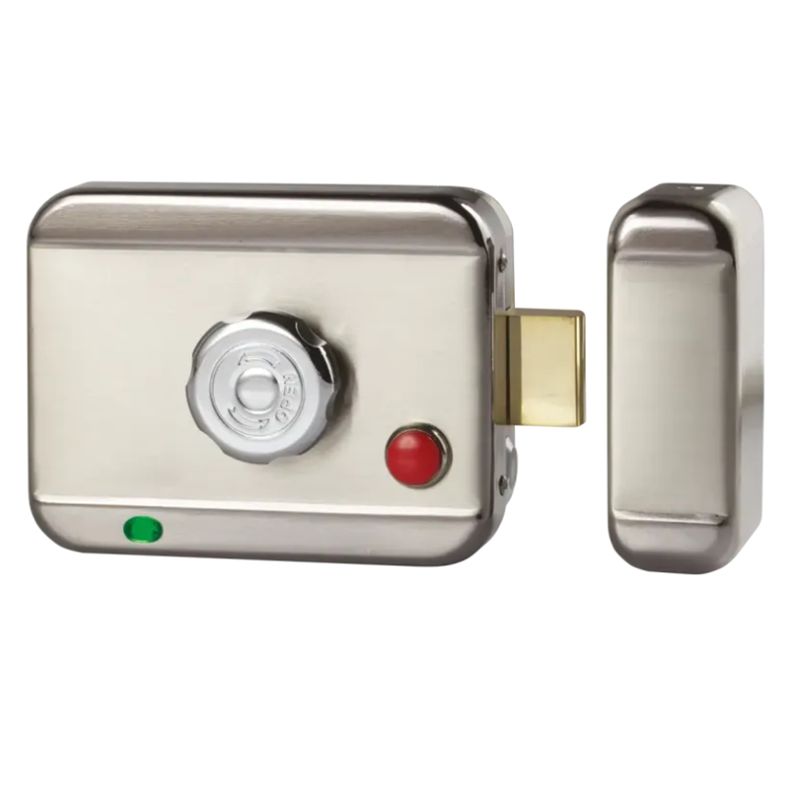 Serrure électrique en applique EGL, bouton moleté à l’intérieur et cylindre à l’extérieur, à rupture de courant, 12 à 24V DC, avec bouton poussoir à impulsion